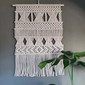 Dit wandkleed met moderne touch door de geometrische en rechte lijnen. Dit concept kan uiteraard ook naar wens aangepast worden in kleur, patroon en formaat. Kleur, naturel.