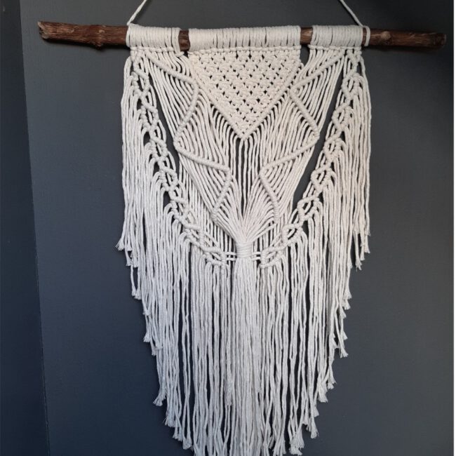 Wandhanger Luna 60 cm €55,- Het patroon van deze wandhanger is afgeleid van wandhanger ‘Bo’. In de kleur naturel. Category: Wandhangers Date: juni 2, 2023